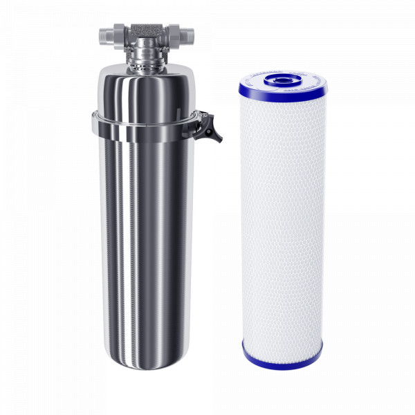 Не забывайте учитывать и срок службы фильтра: он указан в паспорте и определяет, когда модуль нужно заменить, даже если ресурс активной фильтрации в литрах еще есть.40000Вес, кг (нетто) изделия7,5Высота, смОбратите внимание на габариты фильтра и измерьте, сколько свободного пространства в предполагаемом месте установки.59,5Механическая фильтрацияЗадерживает ржавчину, ил, песок, как “сито”. Если в фильтре несколько картриджей - первый отсекает самые крупные частицы, а каждый последующий - более мелкие. Существуют картриджи, в которых есть только механическая очистка (полипропиленовые, не “впитывают” растворенные примеси). Они обычно стоят первыми по ходу воды, чтобы продлить жизнь угольным (сорбционным) картриджам, которые ещё и впитывают вредные примеси, как губка.даСорбцияСпособность “впитывать” из воды растворенные, “невидимые” вредные примеси, по принципу губки. Активированный уголь - основной сорбционный материал, который используется в картриджах фильтров для питьевой воды. Например, именно так из воды удаляется хлор.даФильтрует частицы крупнее, мкмЧем меньше цифра, тем более мелкие частицы способен задержать фильтр. Например, любой фильтр под мойку справится с ржавчиной, илом и песком, но не каждый - с бактериями (на это способен картридж с половолоконной мембраной и системы обратного осмоса). Если в фильтре несколько картриджей - первый отсекает самые крупные частицы, а каждый последующий - более мелкие. Цифра указана для картриджа самой тонкой очистки.1,0Фильтрующий модуль в комплектедаДавление в водопроводе не более, атмМаксимальное давление воды на входе в систему, при котором возможна стабильная работа фильтра.6,5Ширина, смОбратите внимание на габариты фильтра, и измерьте, сколько свободного пространства в предполагаемом месте установки.18,0Глубина, смОбратите внимание на габариты фильтра, и измерьте, сколько свободного пространства в предполагаемом месте установки.18,0Защита корпуса от гидроударовдаСкорость фильтрации, л/минСкорость подачи отфильтрованной воды из крана чистой воды на мойке. Например, при скорости фильтрации 2,5 литра/минуту стакан 200 мл. наполнится меньше, чем за 10 секунд.10,0КомплектацияГотовый фильтр состоит из корпуса и картриджа для очистки воды. Если вы приобретаете только корпус, необходимо отдельно купить подходящий к нему картридж: это может быть картридж для механической очистки воды от ржавчины, картридж для глубокой очистки воды от хлора.готовый фильтрВодаКартриджи и корпуса фильтров рассчитаны на определенную температуру воды. Данные технические характеристики важно учитывать, поскольку от этого зависит качество очистки и срок службы фильтра.холоднаяМатериал корпусаПищевой пластик: Допущен к контакту с пищевыми продуктами. Нержавеющая сталь: Долговечный и безопасный корпус из нержавеющей пищевой стали.нержавеющая стальОчисткаМеханическая очистка: Задерживает ржавчину, ил, песок, как “сито”. В корпусе предфильтра с механической очисткой установлен полипропиленовый модуль. Глубокая очистка: Подходит, чтобы купать детей в чистой воде. Делает прием душа и умывание более приятным. Фильтр глубокой очистки воды во всей квартире не только останавливает ржавчину, ил, песок, но и впитывает растворенные опасные примеси, как губка. Удаляет из воды хлор, хлорорганические вещества, 